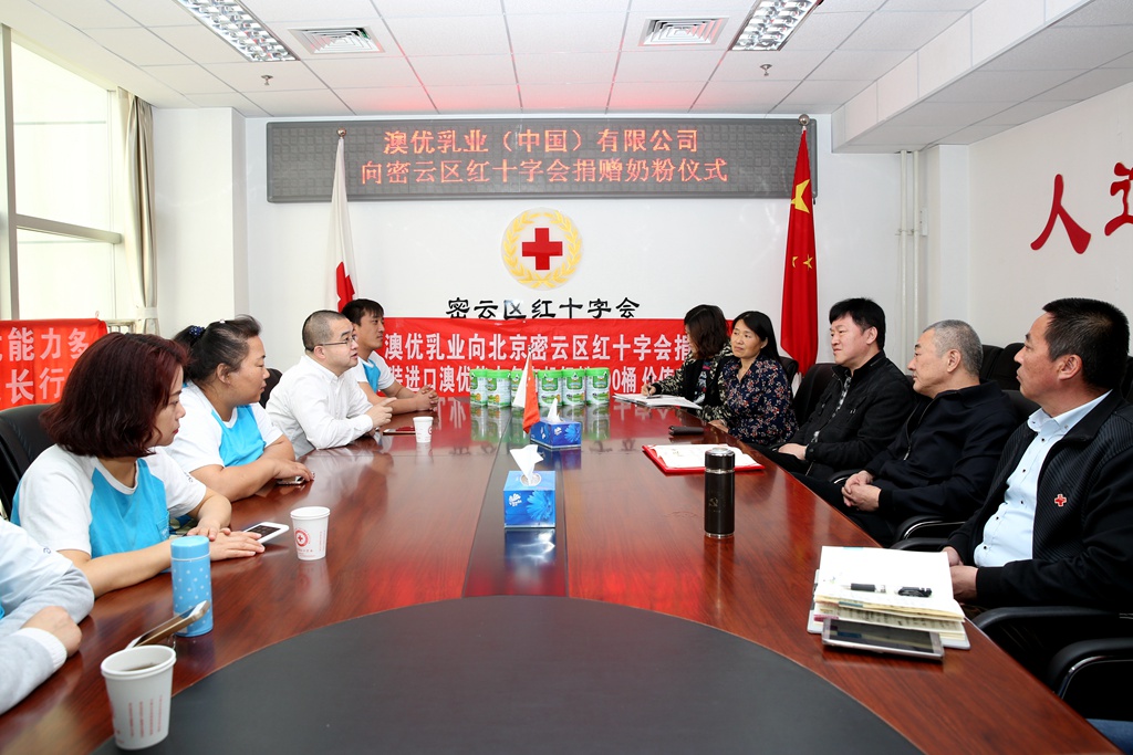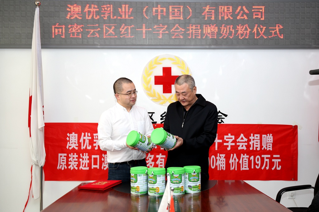 澳优乳业股份有限公司是在香港上市的一家专业高端乳业食品公司,该企业在我区鑫海韵通等商场和部分知名母婴用品店均设有专柜,杨经理表示非常感谢密云地区人民对企业产品的支持,该企业2015年捐赠价值25万元奶粉,2016年捐赠了价值36万余元的奶粉。