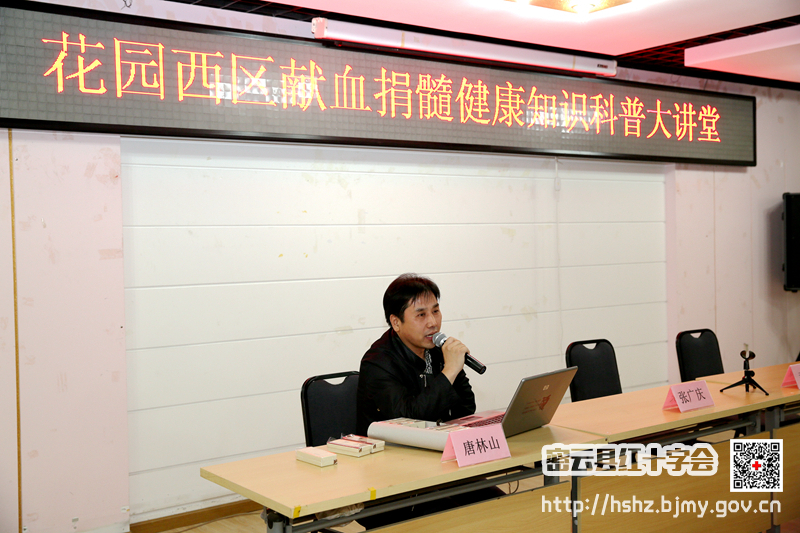 图为:县血站外采科科长唐林山宣讲《我快乐,我健康》