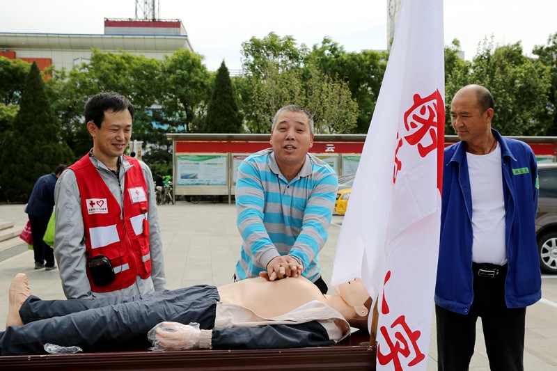 图为:过往群众现场学习并实际操作徒手心肺复苏技术