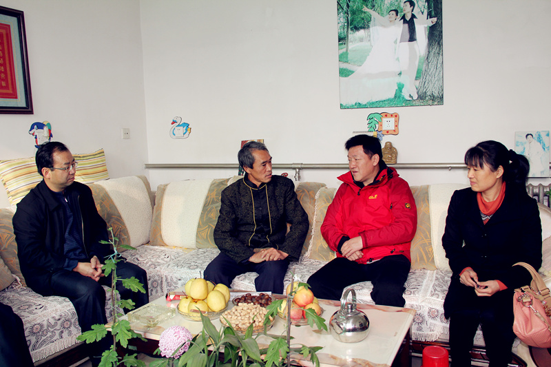 图为:常务副会长郭春友(右2)、东邵渠镇红十字会会长陈宗顺(左1)、业务部部长李艳(右1)同大病患者家属亲切交谈